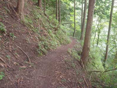 半円の滝を過ぎて、右側の岩壁が終わったところに 登れそうなところがあった。 一休みしてここを登ると、踏み跡があり 杉の伐採跡をジグザグに50メートルほど登ると 登山道に出た。 登山道は左の写真のような平坦な歩きやすい道で 沢からの登りを含めて30分で車まで戻った。 出発から2時間、9:20分に帰着した。 車で帰り支度をしていると、中高年の登山グループ が登って行った。 |