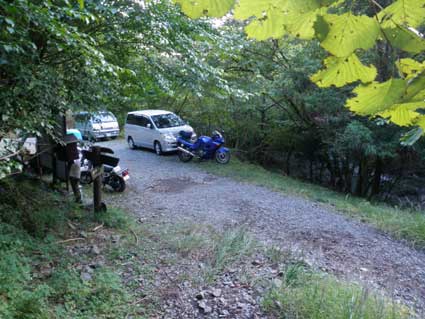 半日時間ができたので短い沢へ行くことにした。 丹沢で短いと言えば小草平ノ沢だろう。 2004/10の記録もあるので参照してください。 朝仕事からかえってきたので出発が午前10時頃になってしまった。 高速道路の混雑を避けるためバイクで出発した。 小草平ノ沢は勘七ノ沢と入渓地点が同じで林道の状態が悪い。 バイクで行ったのだが、到着時ブレーキフルードが沸騰して吹き出していた。 (←)写真の青いバイクが私のだ。 オフロードバイクではなくフルカウルのついたツーリングタイプのZZR400だ。 |