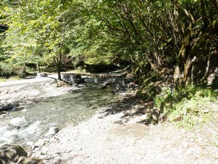 12時5分出発。 沢を渡る橋が架かっているが、橋は渡らずに沢に入っていった。 堰堤を左から越え、勘七ノ沢を左へ見送り、小草平ノ沢へ入っていく。 |