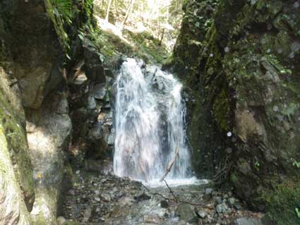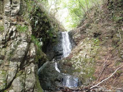 F4 7m 13:10 前回も最上部で少し不安を感じハーケンを打ったが、 今回は途中まで登って不安を感じ、一旦下りて右から登り 懸垂下降してトップロープで登り治した。 これを過ぎるとしばらくして水が涸れ 登山道を通る登山者が見えるようになり斜面をひと登りで 堀山ノ家に到着する。14:10 今回は特に下山用の靴は持参せず、沢靴のまま下った。 尾根道を30分余り下って出発地点に戻った。14:45 帰りは東名高速に渋滞があり、バイクで気持ちよく通過した。 この沢は流程は短いが手頃な滝が多く楽しめるので ちょくちょく来て体を動かしたい。 |