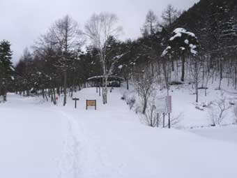 両手にストックを持って雪の林道を黙々と歩いた。 空からもチラホラと雪が降ってきていた。 ゲートから大平原(おおだいらはら)まで何キロあるか測ってみなかったが 宮城から中房温泉までよりは近そうで、2〜3時間だろうと思っていた。 林道を歩き始めて1時間くらいして前方から7〜8人の男女からなる登山パーティが下りてきた。 『常念岳へ向かったが時間切れのため分岐のところで引き返してきた』、と言っていた。 どこの分岐の事か尋ねたが、良く聞き取れなかった。 分岐と言われて最初に思い浮かんだのは、@三股への路と大平原への路の分岐のことだったが、 その他にもA前常念(東尾根と南東尾根の分岐) B常念岳方面と常念小屋へのトラバース道(現在は廃道)の分岐 C常念小屋から常念岳へ向かう縦走路と前常念から常念岳へのルートの交点 があることが頭に浮かんだ。 どこまでトレースがあるかで登りやすさは全然違うが、あまり他人のトレースを前提にしての登山というのは 良くないので、行ってのお楽しみと考えることにした。 約2時間半歩いて大平原の東屋に到着した。11:25 |