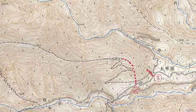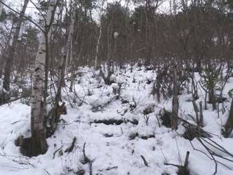 上の25000分の1の地図は少し古いもので、大平原から尾根へ登っていく道が描かれている。 以前はそこにも登山道があったようだが、最近では無雪期にはもっぱら三股からのルートが登られており 大平原からの道は消されている。 積雪期は大平原の東屋付近から尾根上へ向けて適当にルートをとるように書かれたもの幾つか読んだ。 先ほどのパーティのトレースは三股方面へ続いていたが、 私は大平原から尾根末端に取り付こうと思っていたので、スノーシューを履いて果敢にも取り付いてみた。@ 30分ほど悪戦苦闘したが、笹の上に積もった雪が不安定で、全くはかどらず、現実的でないと思い 残念ながら一旦東屋まで撤退した。 我を張らず先達の歩み来た路を辿ることにした。 12:35再出発。場合によっては三股まで行ってしまうのかと思ったが 30分ほど歩いたところに右側の尾根に向かうトレースがあった。(左写真) 上の地図でAと記したところで、林道がS字カーブを描き終わり、道の左側が広くなり、 前方左側にガードレールが見える地点だ。三股へもトレースは続いていた。 このあたりは林業用に付けられたようなピンクテープが多く、紛らわしいが、下山時によくみると 少し離れたところにルートを示すような赤テープもあった。 12:55林の中へ入り尾根へ取り付いた。 私の辿ったトレースよりも右の方にピンクテープが幾つか目に入ったが、 目印よりもトレースを重視して登っていった。 半分程登り尾根近くなると進行の妨げになる木が切られておりある程度整備されたルートになってきた。 日頃運動不足で、林道歩きと@の試登で疲労が蓄積し、両側大腿の筋肉が相次いでつった。 痛みが去るまでじっと耐えたが苦しかった。 |