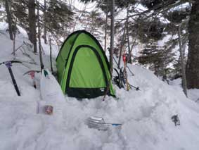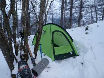 尾根に上がれればどこで幕営しても良いと考えていた。 15:10幕営地と決定。 高度計と地形的には1600mあたりかと思ったが、GPSでは1520mあたりを示しておりがっかりした。 雪は止んでおり、風も無く、穏やかな天気になった。 1本だけ持ってきたビールで入山祝い。プハー 夕食は例によって日清やきそば1.5倍。 今回は独自にフリーズドライ野菜を手に入れていた。 油無しで、FDのキャベツ、ホーレンソウ、メンマを入れた焼きそばになったが美味しくできた。 夜も珍しく無風状態でよく眠れた。 夜間トイレの為に外へ出たら、松本の街の灯りが綺麗だった。星も見えた。 この晴天がいつまで続くか気がかりだった。 |