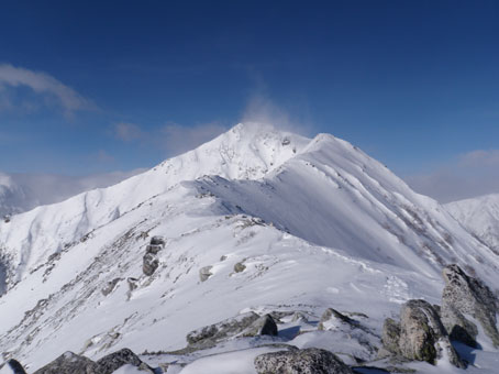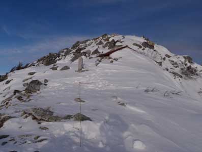 9:00縦走路との分岐点に到着。 先日会ったパーティはここで引き返したようだった。 ここから頂上へは目と鼻の先だ。 |