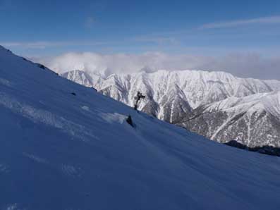 常念岳の冬のルートは尾根通しに登れるので雪崩の危険性が少ない。