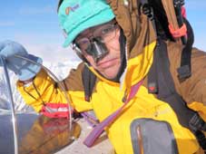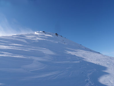 頂上までの斜面は北側になり、カチカチに凍っていた。 ここまではストックとピッケルを持っていたのだが ここからはダブルアックスで登った。 こうゆうかちかちの所の方が登りやすい。 |