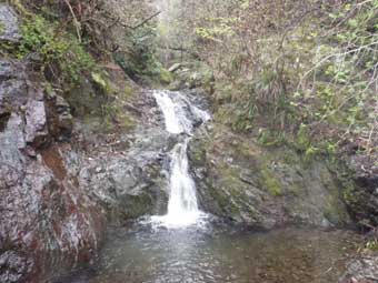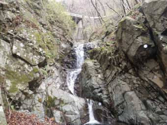 ←左、F5板立ノ滝 右壁を登った 右、林道の大平橋下F6 2段7m曲り滝 |