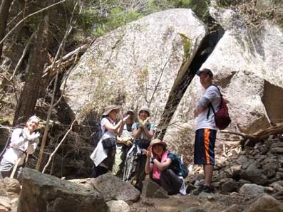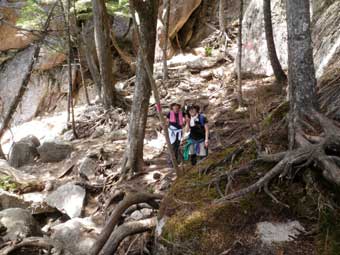 岩の滑りやすいところにはロープが垂れているが、この日は岩が乾いていたのでロープにつかまらなくてもだいたい登れた。