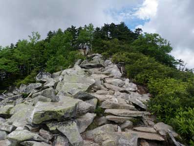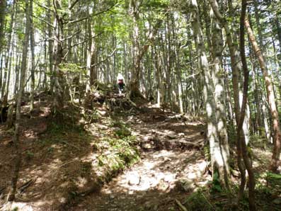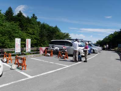 | 大弛峠は駐車スペースが狭く私が到着した8:45頃には既に路上駐車の列が延々と続いていた。 路上駐車は認められているらしく、路面に斜線が引かれているところには止めなければ良いらしい。 私はバイクだったので、車1台のスペースにバイクが1台止められていた横に入り込んだ。 先客のバイクはすぐに出ていったので、私のバイクを横に寄せて車にスペースを譲った。 上の写真、白い車の隣の白いバイクが私のCB400。 いままでZZRだったが、この5月に買い換えた。 身支度をして9:00頃出発。樹林帯の中を登っていく。 |