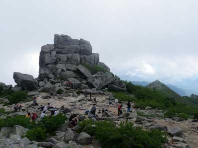 | 雲の晴れ間から五丈岩が見えた。5月に職場の人と登った瑞牆山も形良く見えた。 | |