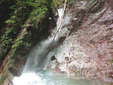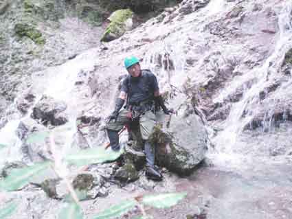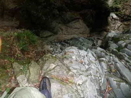9:50左俣の分岐に到着 左俣の分岐にはケルンが積んであるが 左俣の最初の滝が4メートルほどの水流の少ない滝なので見落としやすい。 4メートルの先に2段16メートルがあるように本には書かれているが3段20メートルという感じだ。 左の写真は2段目の8メートルほどの樋状の滝だ。 前回は画面からはみだしている右側のぼろぼろの斜面を登ったが、 今回は水流沿いを登った。 中間部でフォールトが少ないところがあり前回はここを止めてしまった。 今回はまずフックを3個合わせて作った鈎にロープを付けて投げてみた。 何回めかにしっかり引っかかった感じだったのでそれを手がかりに登りかけたが 途中ではずれてしまった。 幸い転落にはつながらなかったがやはり地道な方法で登った方が良いと考え直した。 中間地点の左側にハーケンが1枚打ってあり、それにスリングを通して手がかりとし 足を突っ張るようにして身体を壁から離すと上のホールドに足を乗せることができ その上へあがれた。 その上は簡単だった。 3段目は残地ハーケンに付いたスリングを頼りに登った。 最後の涸棚の前にも3メートル程の涸棚が手がかりが少なく難しいところがあった。 |