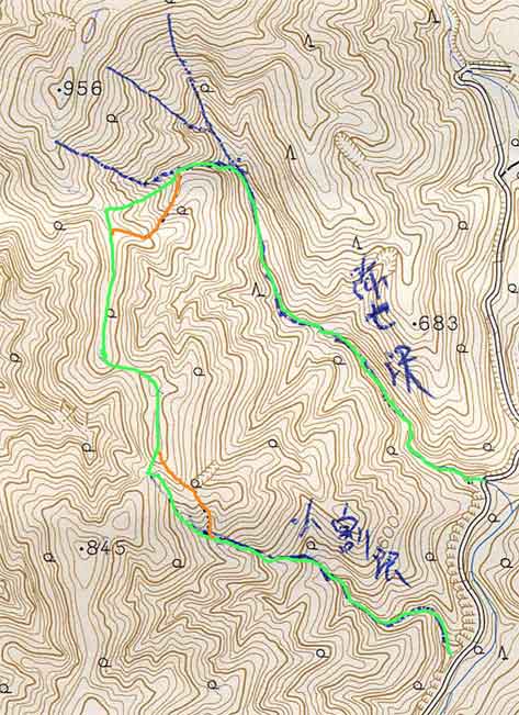 弥七沢は玄倉川流域にあり有名な小川谷廊下の手前にある。 流程は短く、上り詰めたところに山頂はなく、一般登山道もない。 下りにもルートファインデイングが要求される。 沢床は花崗岩で綺麗なナメや釜が多い。 左俣は全ての滝を直登することができる。 前回8月に行った時は左俣分岐後最初の3段20メートルに手を焼き 詰めの部分でも行き詰まりルート変更をし、 小割沢の下降でも下り始めの部分が違ったのではじめから何回も懸垂下降を余儀なくされた。 もう一回行ってみようと思い行ってきた。 左の地図で緑の線が今回のルートでオレンジ色が前回のルート。 余り違いがなかった。 2回めなので、一回目と重複する記述は避けたいので、先月の記録も参照ください。 ナイフを持ってくるのを忘れたのでコンビニでハサミを買った。 懸垂下降するときの捨て縄を必要最小限の長さにするためだ。 今回もバイク(CB400)でアプローチしたが、途中で土砂降りにあった。 出発は前回より少し遅く9:00出発 出発時はほぼ雨は上がっていた。 |