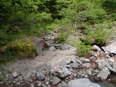二股から稜線への取り付き口までの道。 新緑の山は美しい |