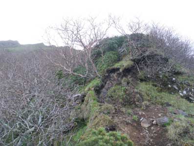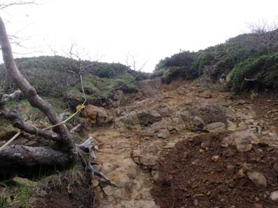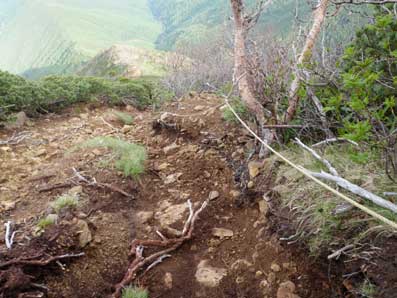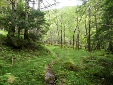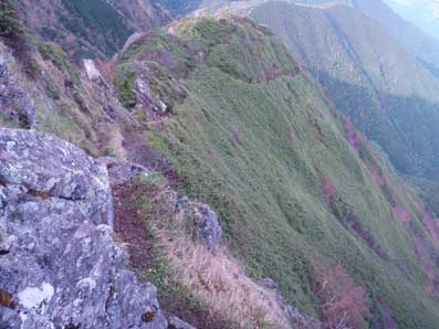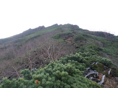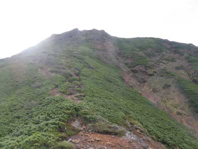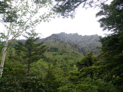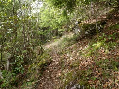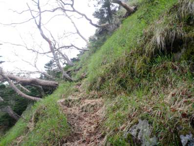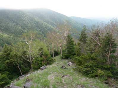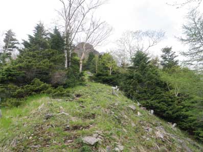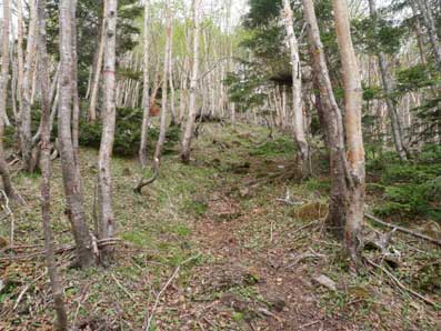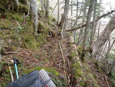 | 木々の間から頂上方面が望める | こんなところを登っていく。上に行くほど平坦地が無くなる。 |