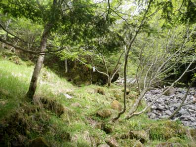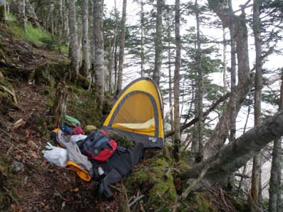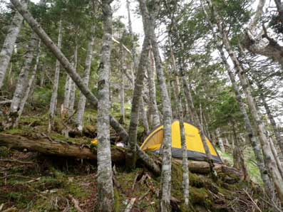 40分ほど登ると下の岩壁帯に着いた。このあたりは平坦地を探すのに苦労する。 倒木に土や枯れ葉が食い止められて少しだけ平坦な場所が出来ている所があったので、 さらに整地して一人用のテントが張れるようにした。 |