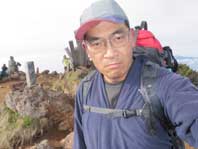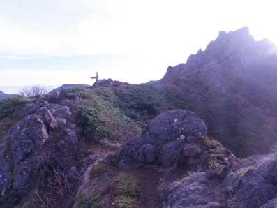 頂上には早くも数人の登山者がいた。 ゆっくり休んでから下山開始。 御小屋尾根を降りることにした。御小屋尾根最上部はロープがしっかり張られているがガラガラの急坂で足下が不安定だ。 大勢いるときは落石に注意が必要だろう。 |