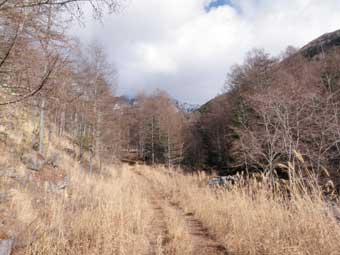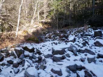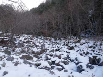 広川原沢の二股に1時間20分ほどで到着。 ここは水が流れていなかった。 |