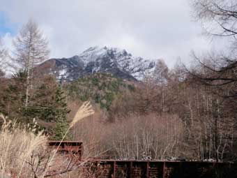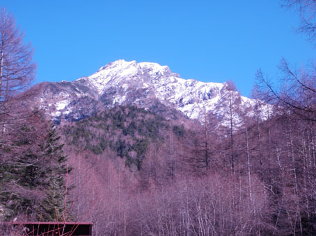 昼までは曇りがちの天気だったが午後から晴れてきた。 明日は一日晴天の予報である。 堰堤のところから見える阿弥陀岳は上部が雪で白くなっていた。 |