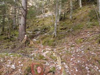 中央稜は取り付き地点が紛らわしい。 右俣がわからも2カ所取り付きがある。 尾根の末端に近いところから登るルートと枝尾根から登るルートである。 どちらも赤テープがたくさん付いている。 私が登りたかったのは枝尾根から登るルートで登り口から尾根までの時間が30分と短い。 何回も来ているのだが、尾根末端へ登るルートにたくさん印が付いており、 今まで気がつかなかった岩に二重丸までついていたので変だなと思いながら少し登ってしまった。 |