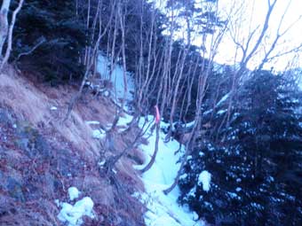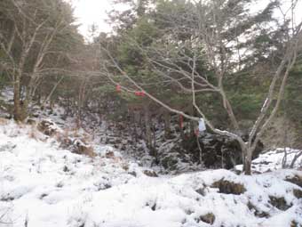 ここに付いている赤リボンも春に来た時よりも増えていた。 枝に縛り付けられたレジ袋はそのままであった。 このあたりは雪の上に足跡は無かった。 先ほどの登り口には水が流れていなかったが、ここには水が流れていたので水筒を満タンにした。 雪を溶かして水を作る手間を減らすためだ。この時点で2リットル持っていた。 |