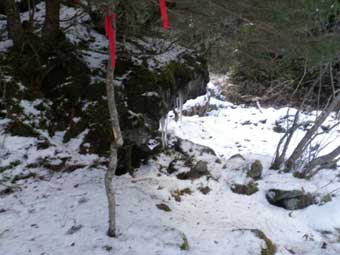 この取り付き地点はすぐとなりに岩小屋がある。 写真で氷柱がさがっているところがそうだ。 |