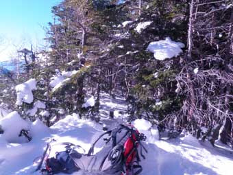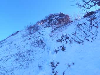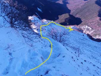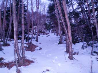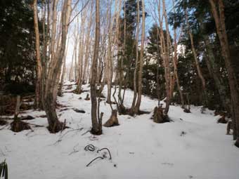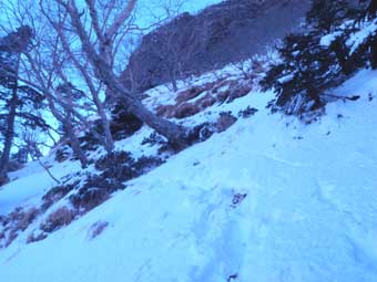 林の中を少し登ると上部岩壁帯基部の雪の斜面をトラバースするところに出る。 特に怖い所はない。 岩壁の左側を回り込んで登るところが少し急傾斜だが特に問題ない。 |