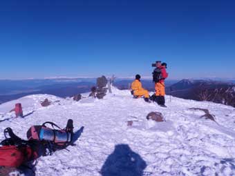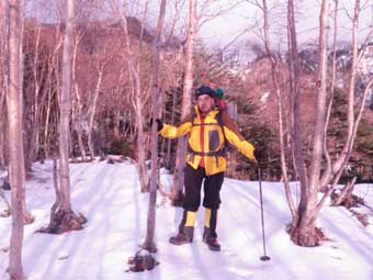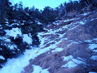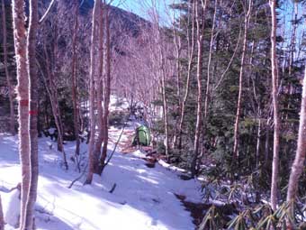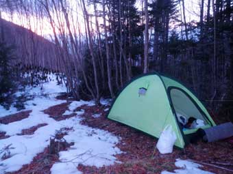 以前にも幕営したところだ。 足跡がなくきれいな雪だった。 標高は約2100メートルで雪はまばらだった。 もう少し先へ進んでも良かったが、ここからでも頂上は狙えるので、鈍った体に無理はさせないで幕営することにした。 ここまでの服装は上は半袖シャツ(ゼロポイント:古い)に長袖のマイクロフリース、下はパンツと長ズボンだけだった。 テントを張る前に長袖のシャツとタイツを追加で着込んだ。 |