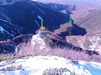黄色い↓が幕営地点で緑の↓が始めに登りかけた尾根の末端。 | |||