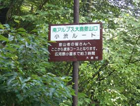 橋の袂には、小渋川ルートは徒渉が20回以上必要であることがかかれており、 その覚悟ができている登山者だけ入るように注意が喚起されている。 |