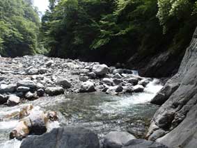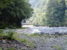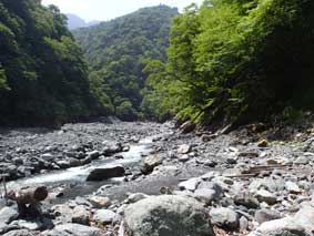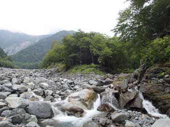 数年前の登山レポートでは橋を渡ってトンネルを通ってから河原におりるように書かれているものもあったが、 平成25年現在はトンネルは通行禁止で橋を渡ったら自然に河原へ進むように道が作られている。 しばらくは護岸工事がなされた歩きやすい道を行くが、護岸工事が終わったところから徒渉が始まる。 ここで沢靴に履き替えた。川は蛇行し片側をあるいていると流れと岩に行くてを阻まれ徒渉が必要になる。 |