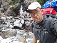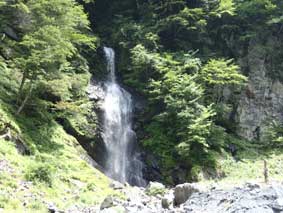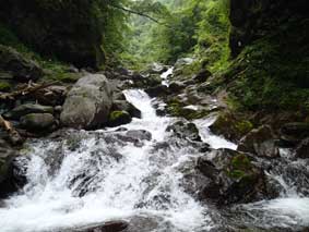 高山の滝までは1時間余でついた。 過去のレポートでは腰あたりまで水につかりながら岩をへつっている写真もあったが、 そのような困難なところは通る必要が無かった。 深いところでも大腿までで股まで水につかることは無かった。 高山の滝の少し先で右から沢が流れ込んでいるところがあり、その水を飲み顔を洗った。 |