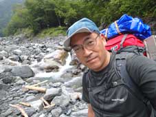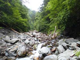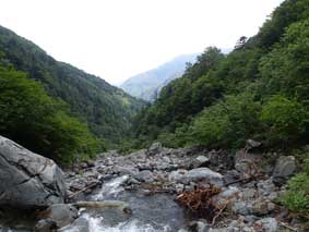 8月9日(金)長崎に原爆が投下され、ソビエトが満州に攻め込んできた日だ。 朝4時半に少し明るくなってきていたので起床。 朝食はスパゲッティを茹で、カルボナーラのソースを絡めて食べた。 テントを畳んで6時に出発。福川の河原を歩いて行く。 暫くして大岳沢が左から合流する右俣の福川へ入る。川幅が狭くなり、 傾斜が急になってくるが、遡行に特に困難なところはなかった。 |