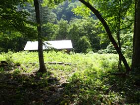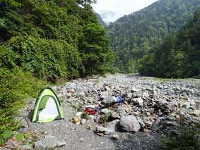 広河原小屋へは樹林帯を少し進む。一人の登山者と出会った。 小屋は少し改装されており入り口にひさしがついていた。 入り口には沢靴が2組デポされていた。 中は奇麗で、ここに泊まってもよい感じだったが、 テントの方が明るく読書がし易いので、福川の河原に幕営することにした。 小屋に泊まった場合も水は福川へ汲みに行くことになる。 小屋から福川までの道は、一升瓶などが散乱し少し汚い。 福川の河原は奇麗で幕営適地がそこここにある。14:00 |