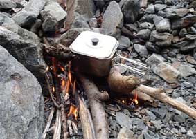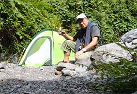 | 水流から離れた平坦地にテントを張った。ビールを川の水で冷やした。 まだ夕食には早かったので,まだ食事にはせず、 少し昼寝をしようと思ったがテントの中は暑くてあまり眠れなかった。 外に出て岩に座ってのんびりとビーフジャーキーをつまんでビールを飲んだ。 夕方16:00ころからたき火をした。乾いた薪が豊富でティッシュペーパー2枚ですぐに火がついた。 たき火をしても特に焼くものは無くラーメンを作っただけであとは火を眺めていた。 無風快晴で穏やかな夜だった。星が奇麗だった。涼しくて気持ちよく眠れた。 |