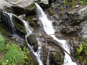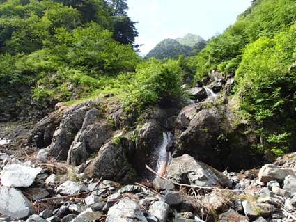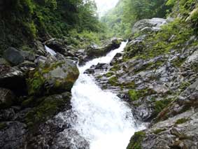 分岐部の滝を越えたところにもまた小滝がでてくる。 暑いので濡れながら気持ちよく登れる。 |