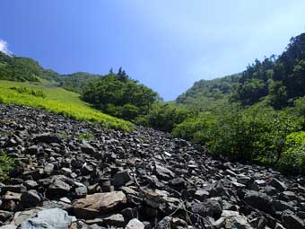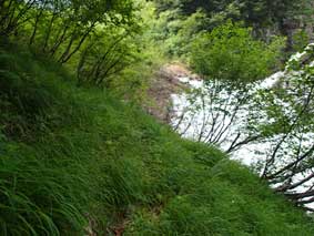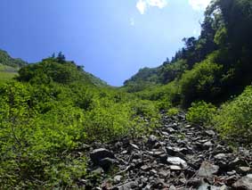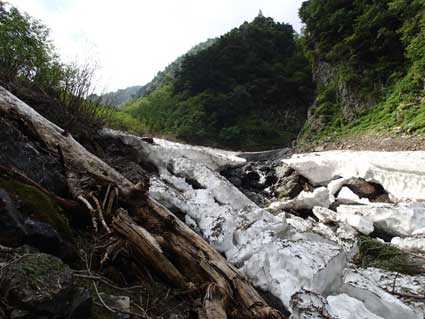 しばらく登ると雪渓が出てきた。 この時期までのこっているとは予想していなかった。 右側がゴルジュ状で左側が草付きの灌木帯の斜面になる地形で沢を離れて左側の斜面に取り付くのだが、 雪渓が大きく残っており少し手前で左の斜面へ取り付くことにした。 |