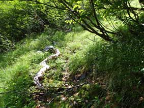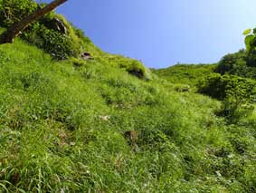 | ゆっくり休んでから、草付きの斜面を登って行った。 始めは踏み跡が無い所を適当に登っていたが途中から昔の登山道と思われる踏み跡が出てきた。 |