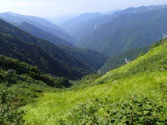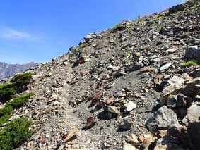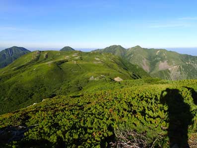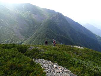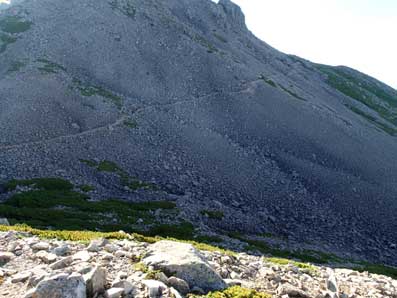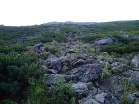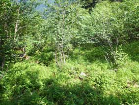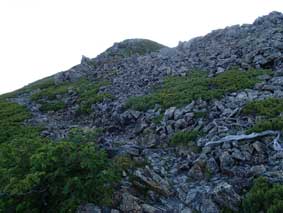 | GPSで位置をしらべると目的のルートよりも東へ寄っているようだった。少し西寄りへルートを変更したかったが、小さな尾根に阻まれて目的の位置までは修正できなかった。 最低コルからかなりずれた地点へ向かっていたので余計な高度をのぼらなっくてはならなかった。がれ場の横の草付きを登って行った。 最後は灌木の藪漕ぎになったが、立ち止まって休んでいたらすぐ先に登山者が見えた。 |