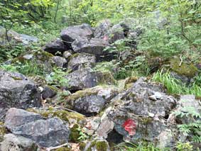 | 岩に赤ペンキの印がついている所もあった。 中間部はルートが正しかったはずだが上部で踏跡が分からなくなった |