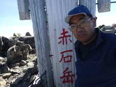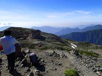 | 赤石岳へはさらに登りが続いて、出発して焼く3時間で赤石避難小屋に到着した。頂上はすぐそこで標高差は30mくらいの感じだ。 小屋によって、オレンジジュースを買って飲んだ。ここでもゆっくりしてから頂上へ向かった。頂上にはすでに数人が居た。 |
