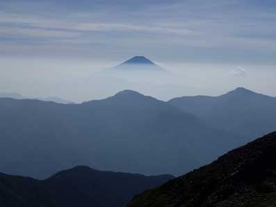 富士山が空中高い所に浮かんだ感じでみえたのがすごかった。 赤石小屋では電話は通話できなかったが、頂上では通話可能であった。 登頂の連絡をした。のんびりした。 |