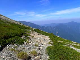 登ってきたところを振り返る。 あそこに登山道があるのか、と分かったので 横向きに藪漕ぎし最後はハイマツを藪漕ぎして何とか稜線へ出た。 通りかかった登山者が驚いていた。15:20 |