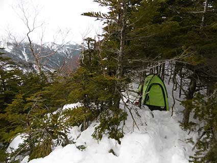 ここは少し平坦な部分があり、森林限界ギリギリのところで、風もよけられる幕営適地だ。