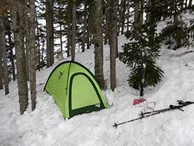 傾斜した林の中で、雪を掘ってテントサイトを作った。