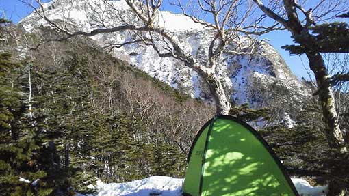 12月4日 朝5:30起床 まだ真っ暗だ。朝食は赤いきつね。 今回水は750の水筒と500mlのテルモス2本持ってきており、 不動清水の水もくんだので、雪を溶かす必要が無かった。 テントを張ったまま6:30に出発した。 |