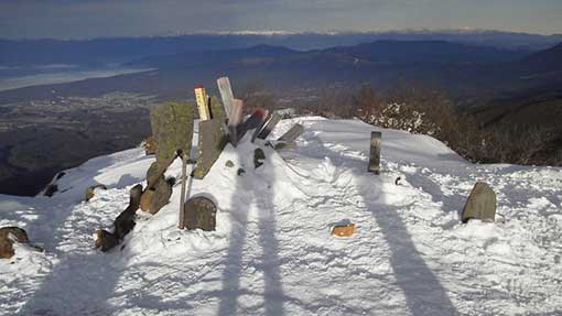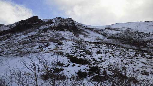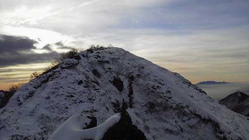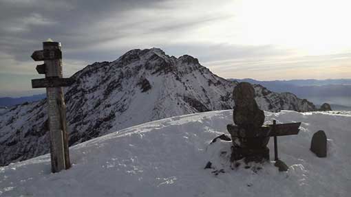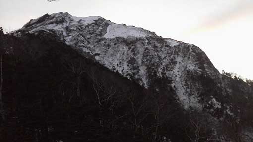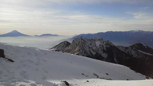 御小屋尾根の登りの最後の部分はかなり傾斜が急だ。 まだ雪が少なく、岩の表面が凍結しているところがあった。 フィックスロープがあったので、問題なく登れたが、 ロープが無かったら、中央稜と比べてどっちが難しいかわからない。 |