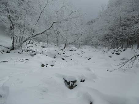 阿弥陀岳中央稜には何回ものぼっているが、12月から3月までは登頂できていない。 今回は厳冬期に登頂したい気持ちで出かけた。 しかし、今シーズン最大の寒波が来るという予報がでていたので、状況によっては無理せず撤退しようと思っていた。 前夜発、韮崎辺りで宿泊し、7時15分頃舟山十字路に到着した。 大寒波が来るという予報ではあったが、山梨県のこの辺りは降雪はないという予想をしていた。 日の出前は天気が良くわからなかったが、舟山十字路に到着し、既に予想より天気が悪いと感じた。 車は数台とまっていて、出発の準備をしているパーティーもいたが、皆広河原沢奥壁の氷瀑を登る人たちばかりであった。 小雪がちらつく中を出発したのは7:45頃だった。 いつもは出だしではオーバーズボンははかないのだが、少し寒いような気がして、はじめから履いて行った。 写真は二股の少し先。右股 |