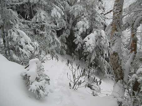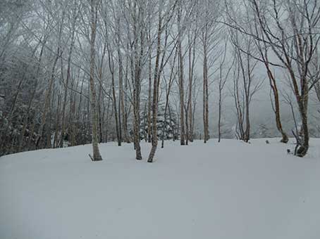中央稜の取り付きまでは、アイスクライミングの人たちと共通なのでトレースがあったが、 そこからはトレースのない孤独な旅路のはじまりだった。 しっかり着込んでいたので体は寒くなかったが、手がいつもの手袋とオーバーグローブの2レイヤーでは寒く、 普段あまり使わない3レーイヤーシステムに変更した。 まだ樹林帯なのに、ほほのあたりが以前中央アルプスで凍傷になった時と同じようにつめたかったので、 この寒気のなかで稜線に出て強風にさらされたら危ないなと思った。 このルートのなかで私の気に入っている2200メートル台地までは登ろうと思った。写真はその台地 時間はまだ12時まえだった。もっと登れるところまで登って幕営するというてもあったが 翌日はもっと寒波がつよくなる予報だったので、今回は撤退してしまうことにした。 |