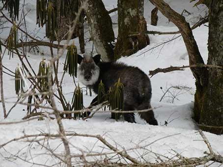 阿弥陀岳中央稜には何回ものぼっているが、12月から3月までは登頂できていなかった。 先月は2500メートルで退却してきてしまったが、今回はようやく完登できた。 中央稜へ足を運んだのは16回め。 ルートについては以前のレポートの方が詳しいと思うので、 例えば2012年2月のレポートなどを参照してください。 今回は舟山十字路に朝7時前に到着し、7:10に出発した。 二股付近でカモシカの子供に会った。 カモシカはあまり人間を恐れない。声をかけたり、手を振ったりしてもにげなかった。 むしろ少し近づいてきた。元気をもらった。 |