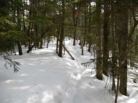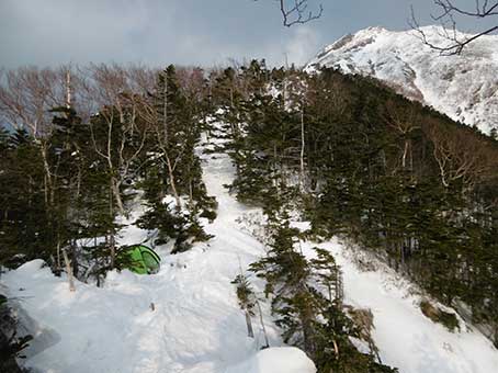 二股から先は右股の方へ進んだ。 冬には広河原沢奥壁方面へアイスクライミングに行く人が多くて、 トレースがしっかり着いていることが多いのだが この日は途中でトレースがばったり途絶えた。 中央稜への夏道と同じ取り付きまでは辿り着くのが困難と思えた。 中央稜の末端付近から取り付いているトレースがあったので、 それにお世話になることにした。少し引き返した。9:30ころ。 このルートは私が2012年2月に登ったときと同じものだ。 中央稜の末端に近い方から稜線に出るまではトレースがあったので楽に登れた。 |